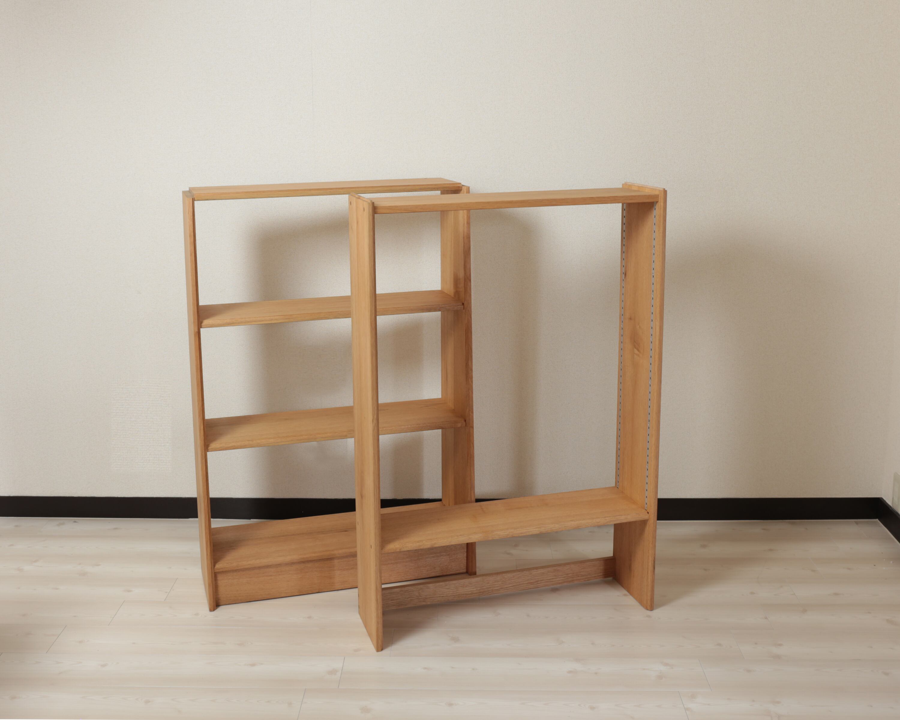 上下2分割の本棚+突っ張りパーツをお客様に組み立ていただきます。
